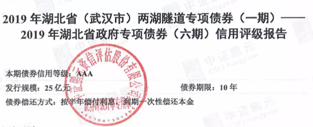 经中证鹏元资信评估股份有限公司对湖北省政府本次拟发行的25亿元2019年湖北省(武汉市)两湖隧道专项债券(一期)——2019年湖北省政府专项债券(六期)的评级结果为AAA。