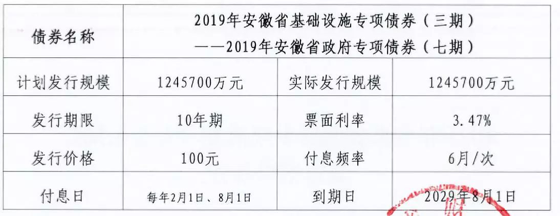 本项目总投资 52000 万元,其中 12000 万元来自资本金投入,占总投资 23.08%;40000 万元来自债券资金,占总投资 76.92%。其中 2019 年发行23000 万元,2020 年发行 17000 万元,债券期限 10 年期,利息每半年支付一次,本金到期一次性支付。2019年7月31日,2019年安徽省基础设施专项债券(三期)—2019年安徽省政府专项债券(七期)正式发行。