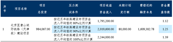 根据天津市铁路建设专项资金筹集使用管理办法(津政办发[2015]33号)规定:铁路建设专项资金按照全市以招标、拍卖、挂牌方式出让商业、旅游、娱乐、商品住宅等经营性建设用地使用权的出让面积每平方米200元筹集,专项用于在建铁路项目资金来源。本期债券募投项目收益为铁路建设专项资金产生的现金流入,根据财务评估报告可以得出,本项目相关融资未来应还本付息总额为1609382.78万元,接近五年铁路建设专项资金流入平均值的100%比例计算,项目产生的净现金流入为2244000.00万元,本息覆盖倍数为1.39,当铁路建设专项资金在变化-10%和-20%的情况下,专项债券本息覆盖倍数仍大于1.1倍,均可实现现金流量覆盖。