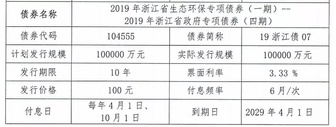 2019年7月9日,2019年浙江省生态环保专项债券(一期)--2019年浙江省政府专项债券(四期)正式发行。实际发行金额是10亿元,期限10年,票面利率为3.33%。