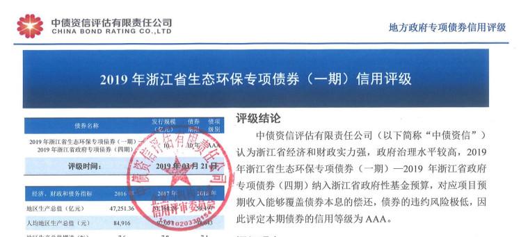 经中债资信评估有限责任公司综合评定,2019年浙江省生态环保专项债券(一期)--2019年浙江省政府专项债券(四期)信用评级为AAA。