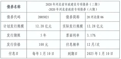 2020年1月9日,2020年河北省市政建设专项债券(二期)-2020年河北省政府专项债券(六期)正式发行,利率3.17%,期限为5年。