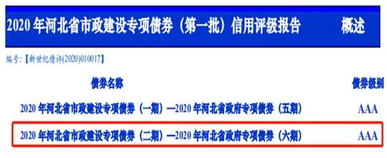 上海新世纪资信评估投资服务有限公司对2020年河北省市政建设专项债券(二期)—2020年河北省政府专项债券(六期)的评级结果为AAA。
