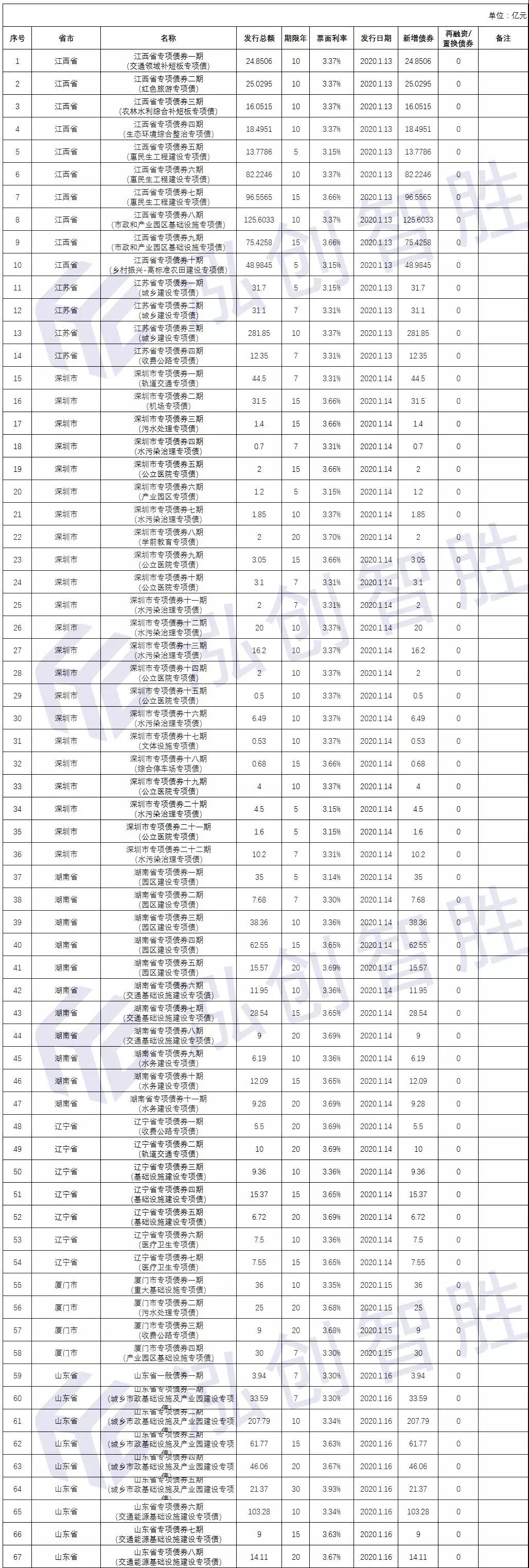 3.根据中国债券信息网统计,截止1月19日,2020年已发行和已披露待发行的地方政府债券金额超8600亿元。其中新增专项债券超7800亿元,约占提前下达新增专项债券额度的八成,发行进度大幅提前。