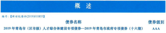 经上海新世纪资信评估投资服务有限公司对2019年青岛市(区市级)人才综合体建设专项债券—2019年青岛市政府专项债券(十六期)的评级结果为AAA。