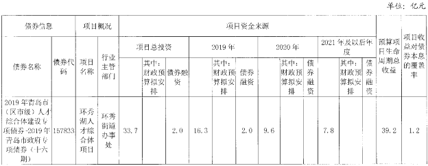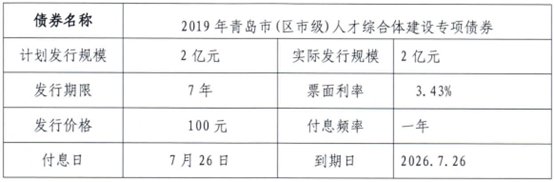 2019年7月25日,2019年青岛市(区市级)人才综合体建设专项债券正式发行,利率3.43%,期限7年,其中本项目发行2亿元。