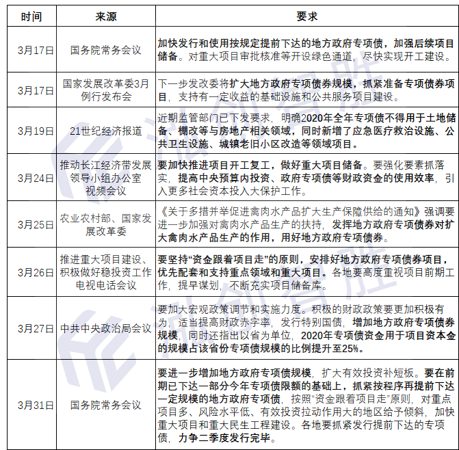 3月多个政策及重要会议频繁提及专项债券,显示出专项债券以及项目储备的重要性。