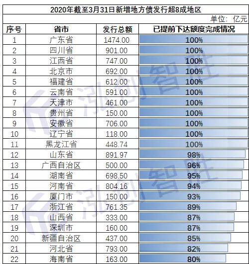 截止3月31日,2020年已发行新增地方政府债券15424亿元,完成已提前下达额度的83.46%,额度即将发行完毕,至少有广东省、四川省、江西省、北京市、福建省、云南省、天津市、贵州省、安徽省、辽宁省、黑龙江省等11个地区完成了已提前下达的额度,山东省、广西自治区、湖南省、河南省、厦门市等地已完成超9成,多地额度告急,再次提前下达额度,可有效解决多地有项目待建但无额度局面。(注:部分省份无官方披露提前下达额度,未计算发行进度;发行额确定,进度统计可能存在轻微偏差。)