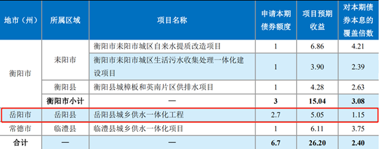 岳阳县城乡供水一体化工程收入来源为岳阳县二水厂及筻口水厂的自来水水费收入。债券存续期合计项目收入为77104.30万元。