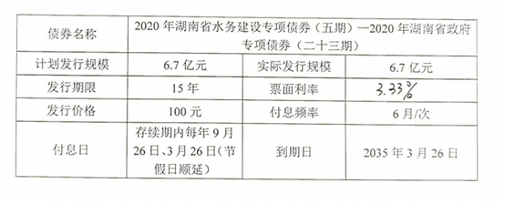 2020年3月25日,2020年湖南省水务建设专项债券(五期)-2020年湖南省政府专项债券(二十三期)正式发行,发行金额为6.7亿元,其中本项目发行2.7亿元,利率3.33%,期限为15年。