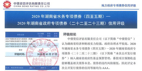 经中债资信评估有限责任公司认定,2020年湖南省水务建设专项债券(五期)-2020年湖南省政府专项债券(二十三期)的信用等级为AAA。