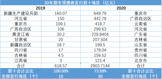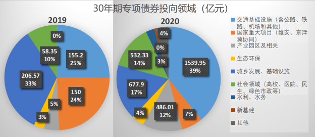 下图为2019年和2020年(截至6.28)30年期专项债券涉及领域的大致分类,主要依据为各地发行时的分类,发行时为“普通专项债券”的,则依据发行信披文件将金额具体拆分。