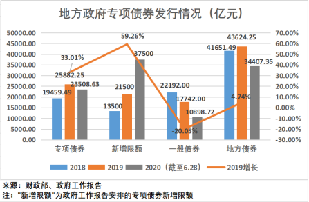 2020政府工作报告拟安排年内新增专项债券限额为3.75万亿元,较去年增加幅度达74.42%。截至6月28日,2020年以来地方政府专项债券已发行了23508.25亿元,规模达到2019全年发行量的90.83%;其中新增专项债券规模为22102.08亿元,已完成本年下达额度的58.94%。专项债券提速增效力度不断加大。