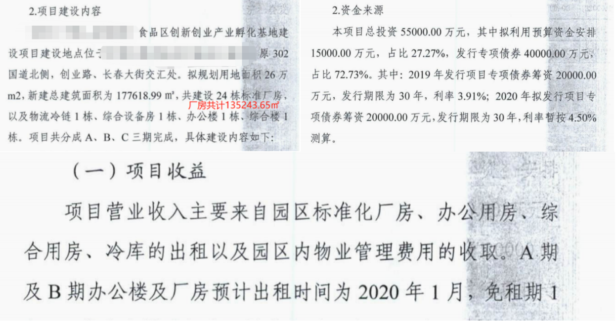下图为一个产业园建设项目所披露的项目情况,项目已于2019和2020年分别发行30年期专项债券2亿元,累计债券融资4亿,项目总投资为5.5亿。项目建设内容主要是标准厂房和办公设施。