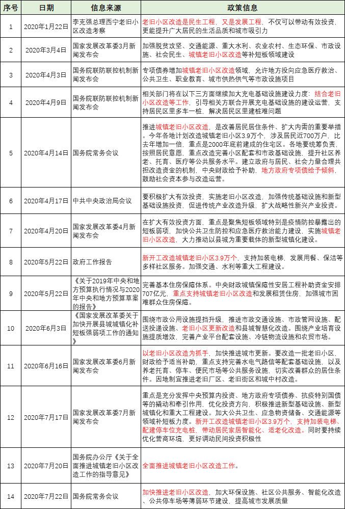 党中央、国务院、发改委、财政部等高度重视城镇老旧小区改造工作总体推进情况,2020年至今多次印发文件、召开会议推进老旧小区改造,并支持发行专项债券用于老旧小区改造。根据当前相关政策会议,不难看出老旧小区改造将是今年乃至十四五时期政府投融资的热点领域。二、老旧小区改造-2020年及十四五时期重点工作