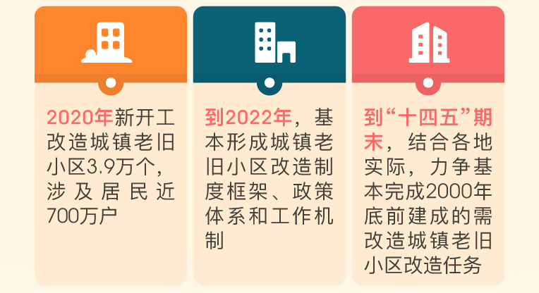 国务院办公厅公布的《关于全面推进城镇老旧小区改造工作的指导意见》,提出2020年全国计划改造的城镇老旧小区大概是3.9万个,“‘十四五’期末力争基本完成2000年底前建成的需改造城镇老旧小区改造任务”的目标。