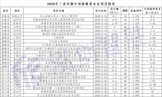 (一)河南省新建新郑机场至郑州南站城际铁路项目建设内容:本线线路自在建郑州至新郑机场城际铁路新郑机场站(地下站)引出向东,以地下敷设方式走行于规划东进场公路北侧,于机场构筑物北侧设韩庄乘降所,继续向东下穿滨河西路(规划)、南水北调工程、滨河东路(规划)、会展路(拟建),出地面后上跨东进场公路(规划)和省道S102,引入拟建郑州至万州客运专线郑州南站(城际场),正线全长11.144km(双线),其中:先期实施土建工程0.397km。全线桥梁(含高架站)长1.234km,桥梁比11.07%,地下段(含地下站)长6.527km,隧道比58.57%,桥隧总长7.761km,桥隧比69.64%;新建郑州南站(城际场),郑州南站南端预留至登封至洛阳城际铁路接轨条件。全线设韩庄乘降所1 座,新建郑州南站1 座。资金构成:机场工程总投资为590449.38万元。根据初步设计批复,机场至郑州南站城际铁路项目建设投资为541062.00万元,项目资本金拟占建设投资的50%,约27.1亿元。在考虑建设期财务费用等因素之后,本项目资本金共计280699.38万元,占资金筹措额的47.54%。其中河南铁路投资有限责任公司、郑州市地铁集团和国开发展基金共计出资209655.00万元,占资本金筹措总额的36.02%;发行专项债券用于补充资本金68000.00万元,占资金筹措总额的11.52%。项目已于2019年取得浦发银行的用于固定资产建设投资长期贷款29950.00万元,根据施工进度,预计将于2020年新增用于固定资产建设投资的长期贷款150000.00万元,2021年新增用于固定资产建设投资的长期贷款80000.00万元,2022年新增用于固定资产建设投资的长期贷款49800.00万元。上述四笔长期贷款金额总计为309750.00万元,占资金筹措总额的52.46%。专项债资金占资本金比:在河南省新建新郑机场至郑州南站城际铁路项目中,专项债资金占资本金比例为11.52%。收入来源:该项目收入来源于铁路客运收入及客运相关其他收入等。所有收入均为专项经营收入,没有政府基金性收入。(二)安徽省宣城市宣城至绩溪高速铁路建设工程项目建设内容:项目具体建设内容如下:(1)宣城至绩溪高速铁路工程,新建铁路长111.7公里;(2)皖赣铁路宁国城区段改线工程,新建铁路长17.4公里。资金构成:宣城至绩溪高速铁路项目,项目计划总投资174.26亿元。根据《铁总发改函[2019]77号》关于新建宣城至绩溪高速铁路可行性研究报告批复内容:(1)宣绩高铁项目总投资153.86亿元,根据省政府《关于进一步加快安徽省铁路建设的若干意见》(皖政[2015]27号)要求,先期投入自筹资金107.7亿元由省、市按6:4比例分担,其中宣城市需自筹资金43.08亿元。(2)皖赣铁路宁国城区段改线项目总投资20.4亿元,具体资金筹措方案为全部由地方政府自筹资金解决。故宣城市地方政府出资总额为63.48亿元。本项目专项债券计划筹资63亿元,其中43亿元作为项目资本金投入项目使用,为项目自筹资金107.7亿元的39.93%,符合国家对项目资本金管理的要求。其中:用于宣绩高铁建设工程资金43亿元,分4年发行,2020年(首期)发行13亿元;用于宁国城区段改线工程资金20亿元,分3年发行,2020年(首期)发行8亿元,2020年共发行21亿元。债券期限为10年,债券按年计息,每半年支付一次,债券到期后一次偿还本金。专项债资金占资本金比:在宣城至绩溪高速铁路建设工程项目中,专项债资金占资本金比例为39.93%。收入来源:该项目收入来源于运输收入与土地出让收入。(三)烟台市龙口市污水处理提标改造工程建设内容:龙口市污水处理厂整体提质改造。资金构成:项目总投资5.4848亿元,其中财政资金到位1.4848亿作资本金,发行20年期专项债券2亿元(其中1亿作资本金、1亿作债务性融资),剩余2亿资金缺口由银行贷款融资解决。专项债资金占资本金比:在烟台市龙口市污水处理提标改造工程中,专项债资金占资本金比例为45.3%。收入来源:该项目收入来源于污水处理费、中水收入、水资源费等经营性专项收入以及少量财政补贴。