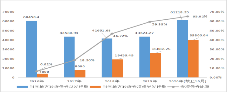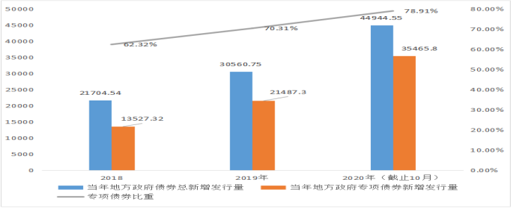 如果从地方政府当年新增债券的角度看,专项债的比重更是从无到有一直达到了如今的78.91%。若加上计划定向配置到银行体系的2000亿元专项债券,则2020年截至10月份,当年度新增专项债券的比重已经到了当年度新增地方债券总量的83.45%。见下表: