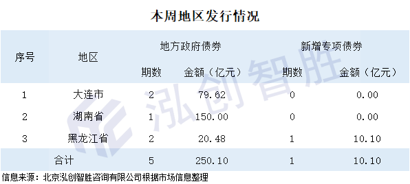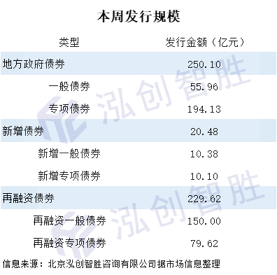 本周发行专项债券194.13亿元,一般债券55.96亿元;本周发行新增债券20.48亿元,再融资债券229.62亿元。