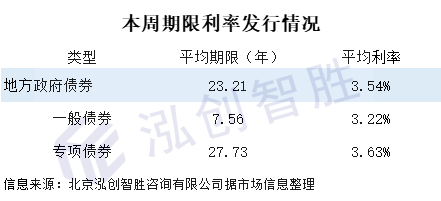 本周地方政府债券发行平均期限23.21年,平均利率3.54%。本周发行的一般债券平均期限7.56年,平均利率3.22%;本周发行的专项债券平均期限27.73年,平均利率3.63%。