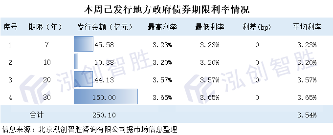 本周地方政府债券涉及4种发行期限,包括7年期、10年期、20年期、30年期。