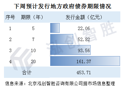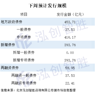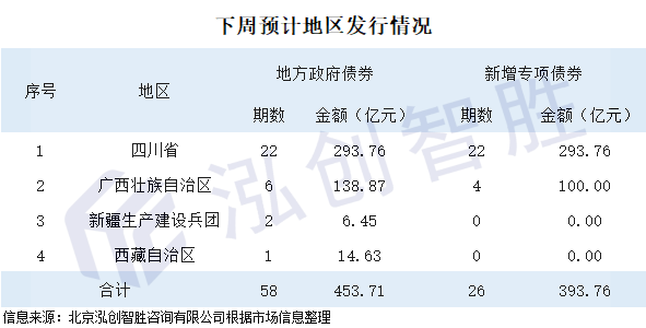 下周预计有4个地区计划发行58期地方政府债券,规模为453.71亿元。