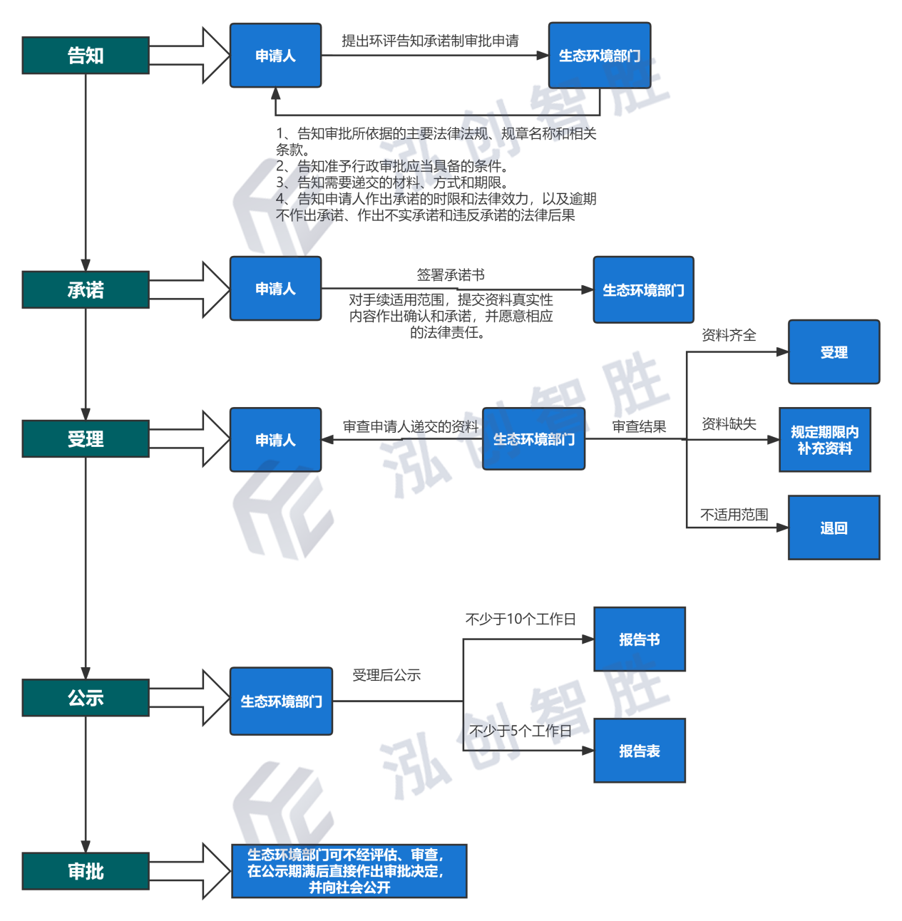 根据各地方生态环保厅文件,环评告知承诺制是指申请人向有审批权的生态环境部门提出建设项目环境影响评价文件告知承诺审批的申请,生态环境部门一次性告知其审批条件和需要提交的材料,申请人在项目开工前向生态环境部门提交符合规定的建设项目环境影响评价文件、承诺书及其他相关材料,生态环境部门不对环境影响评价文件开展实质性评估、审查,经公示完成后直接作出审批决定,并加强事中事后监管。企业按照承诺书规定的时限和内容完成承诺事项,接受生态环境部门的监督管理。因此,环评告知承诺制并非不需要办理正式环评手续,只是将审批过程进行缩短,申请人需提前询问生态环境部门审批条件和需要提交的材料,自行编制相应的环评文件并自认为达到法定审批要求后提交至环境审批部门,环境审批部门对于提交的文件不进行实质性审查,直接作出审批决定。(一)环评部门提前告知。申请人提出环评告知承诺制审批申请,生态环境部门应当通过建设项目环境影响评价文件行政审批告知书等方式,向申请人告知建设项目环境影响评价文件行政审批事项所依据的主要法律、法规、规章的名称和相关条款。准予行政审批应当具备的条件。需要申请人递交材料的名称、方式和期限。申请人作出承诺的时限和法律效力,以及逾期不作出承诺、作出不实承诺和违反承诺的法律后果等。(二)申请单位签署承诺。申请人签署承诺书,对建设项目属于告知承诺制适用范围、所填写的基本信息真实准确性、知晓生态环境部门告知的全部内容、自身能够满足生态环境部门告知的条件标准和技术要求等内容作出确认和承诺,并愿意承担不实承诺和违反承诺的法律责任。(三)环评部门正式受理。生态环境部门对收到的承诺书、环境影响评价文件等要件规范性进行审查,对申请材料齐全的项目予以受理;对申请材料不齐全的,应当场告知建设单位需补正的全部内容,逾期未补正的不予受理;对明确不适用告知承诺制范围的项目依法予以退回。(四)环评文件公示披露。生态环境部门在受理项目承诺书、环境影响评价文件等要件后,应按照环境信息公开相关规定进行受理公示和拟批准公示,其中报告书公示期不少于10个工作日,报告表不少于5个工作日。(五)环评申请获得审批。生态环境部门可不经评估、审查,在公示期满后直接作出审批决定,并向社会公开。优点:有效加快审批速度,让项目早落地、早开工,早让企业获得便利;缺点:生态环保部门在审批前对建设项目不进行实质性审查直接作出审批决定,建设项目随即开工、建成并投入生产运营,若环保部门在事后审查过程中发现项目环评问题,即便撤销环评文件的批复,对于环保部门以及环境影响评价本身,已经丧失了通过审查而做出决定的预防环境问题产生的功能。