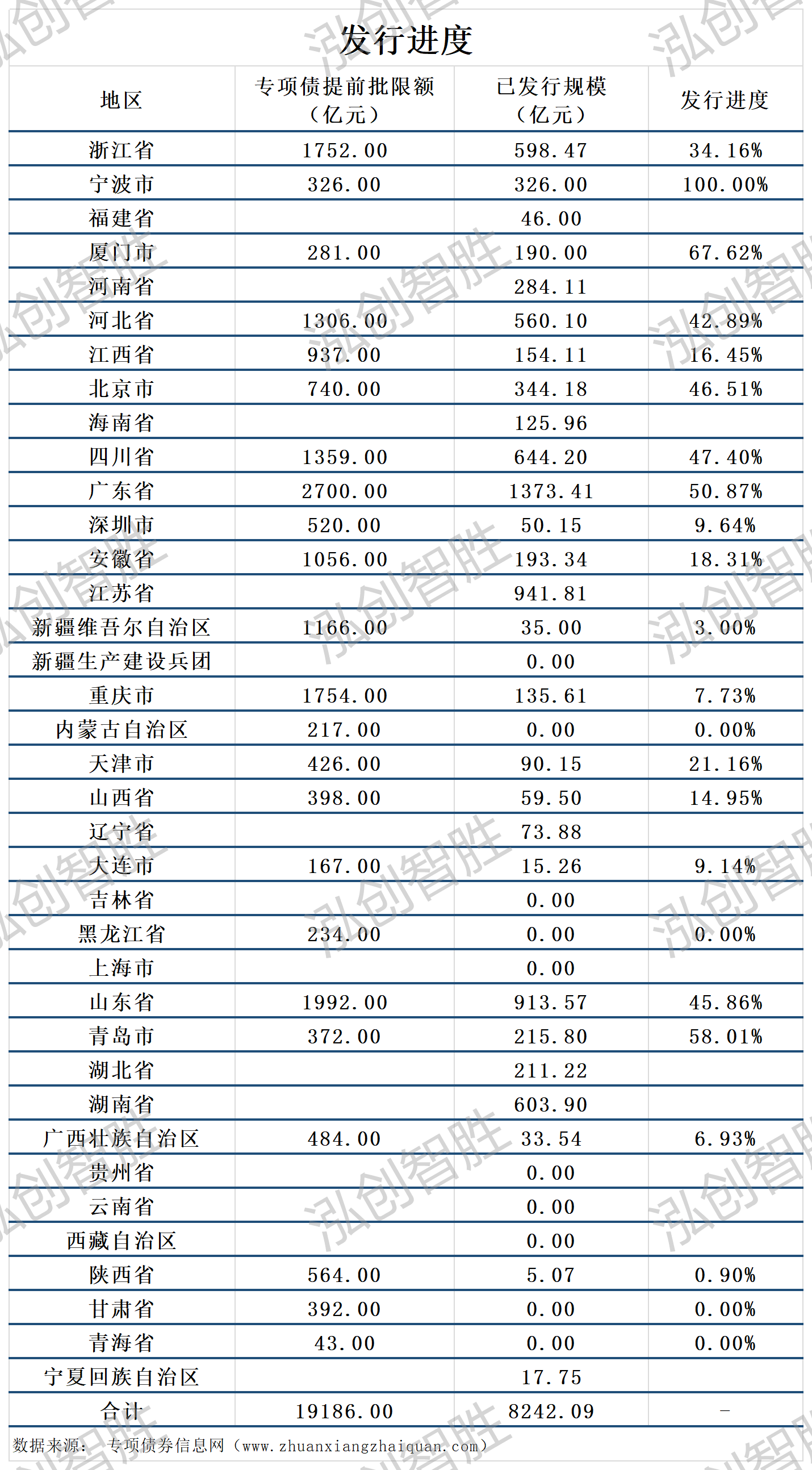 截至3月1日,已经有23个省市公布提前批限额,其中宁波市发行进度最快,发行326亿元的新增专项债券,发行进度为100%。附表:
