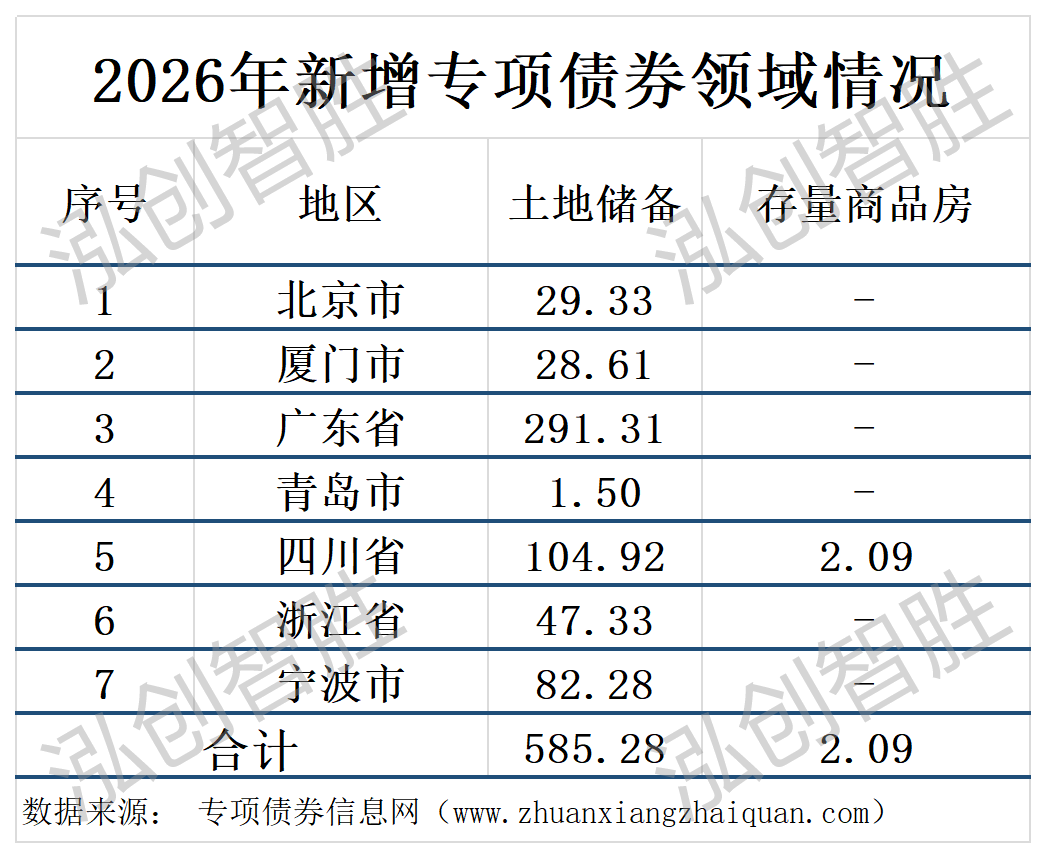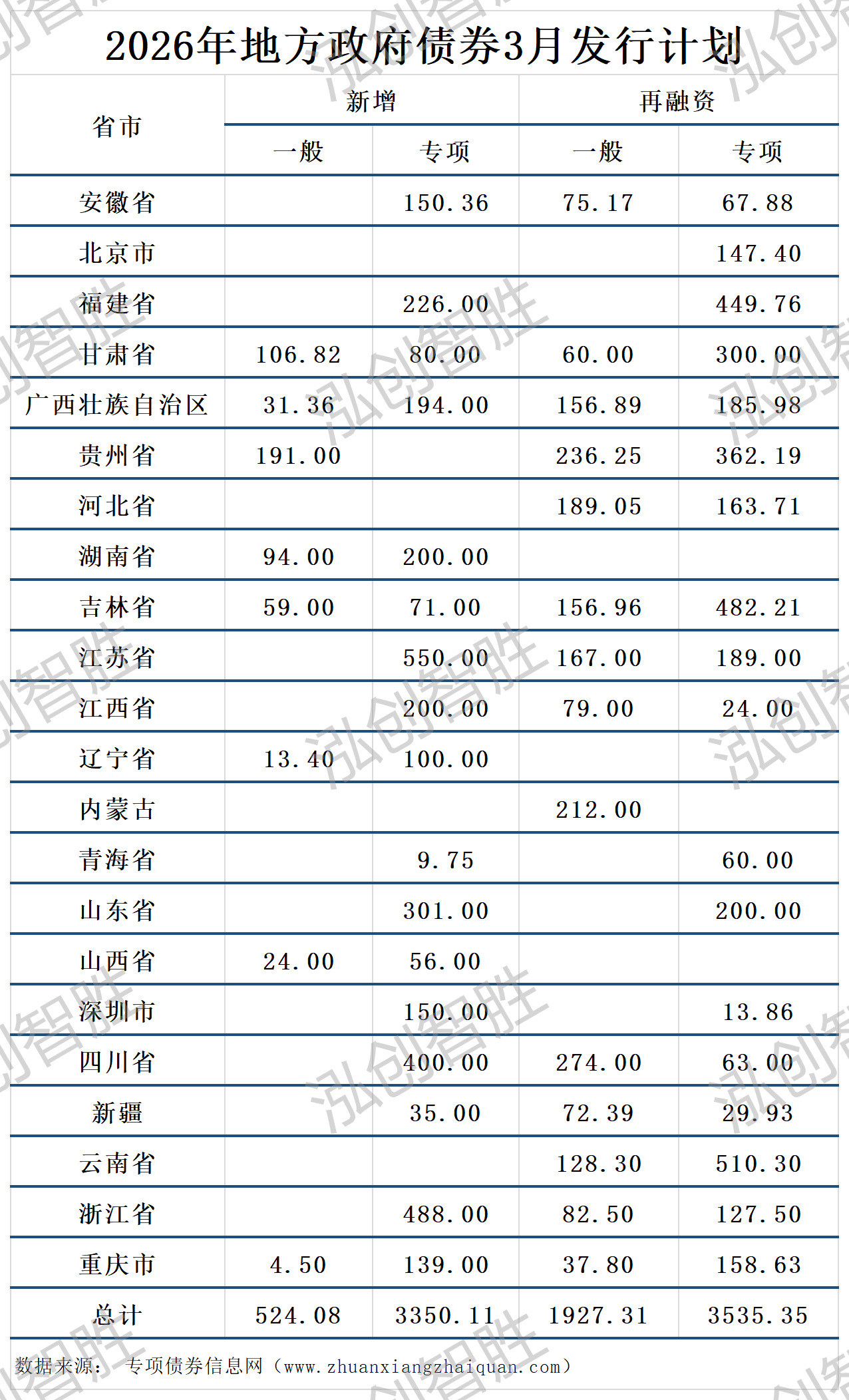 截至3月1日,全国发行新增地方政府债券10346.14亿元,其中一般债券2104.05亿元、专项债券8242.09亿元。全国发行再融资债券9869.65亿元,其中,一般债券2129.69亿元、专项债券7739.96亿元。