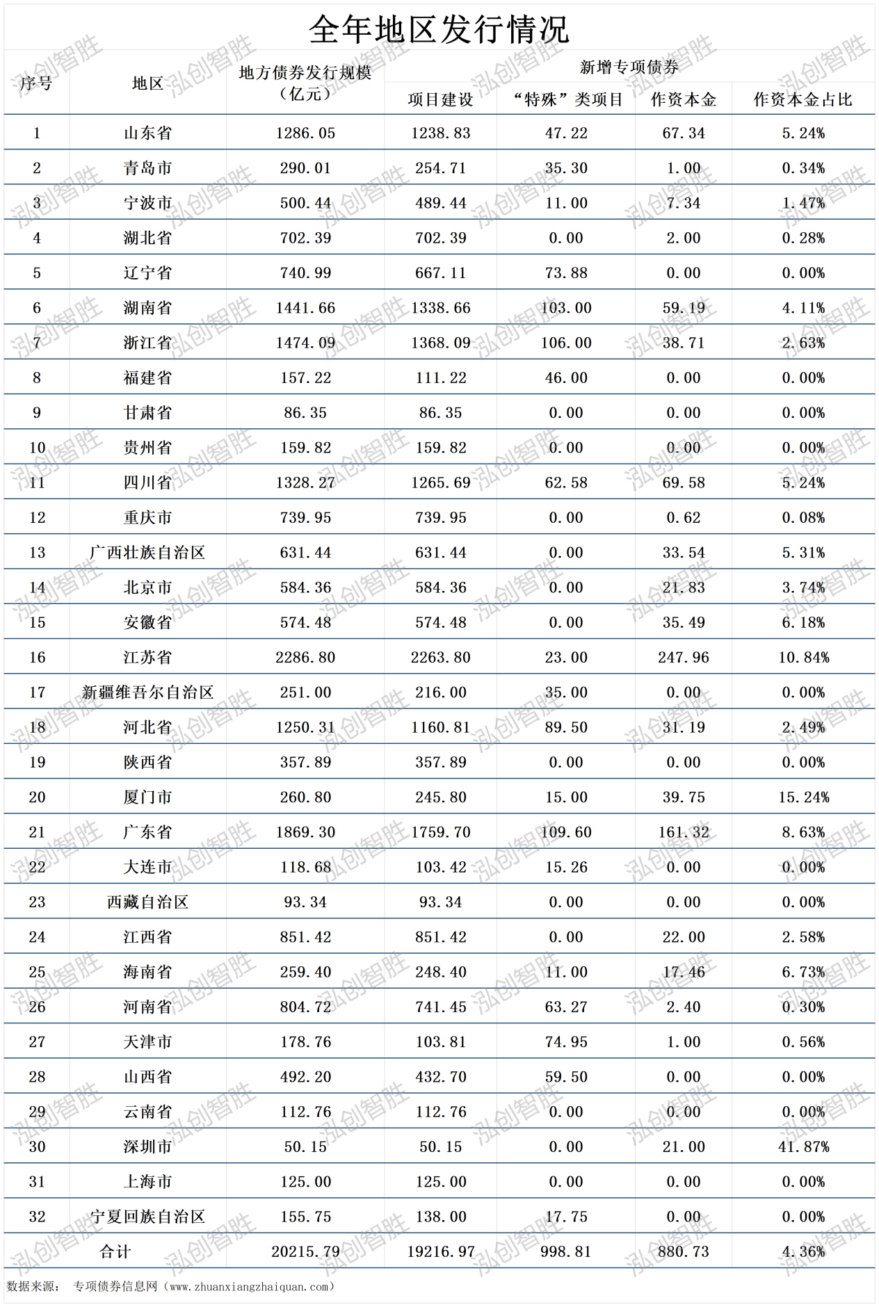 全国发行地方政府债券合计20215.79亿元,其中一般债券4233.73亿元、专项债券15982.05亿元。