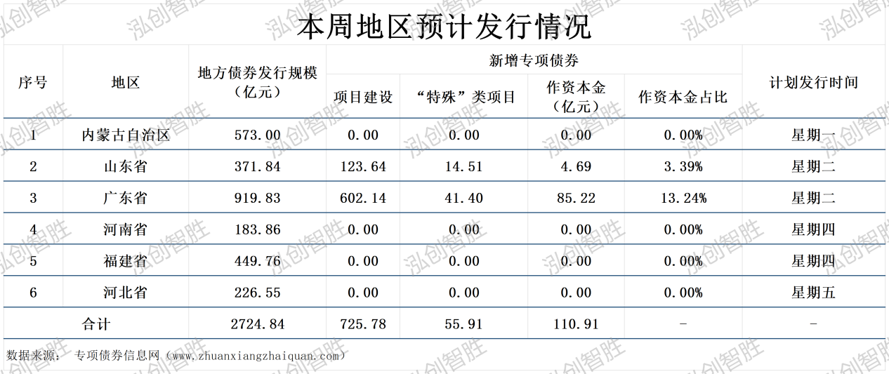 四川、山东、广东等6个地区政府债券发行规模超1000亿元;