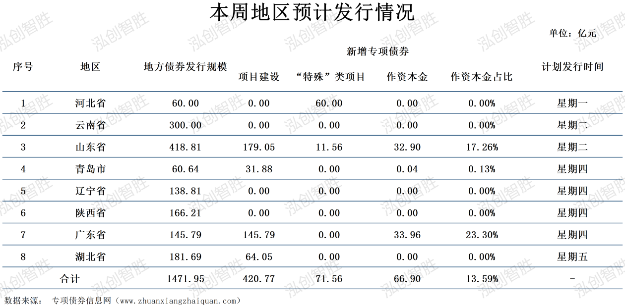 本周共有云南省、湖北省等8个地区计划发行38期地方政府债券,发行规模1471.95亿元;其中,新增专项债券计划发行19期地方政府债券,发行规模492.33亿元。