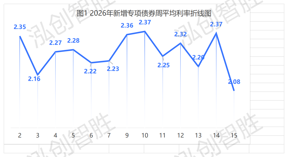 2026年新增专项债券平均利率为2.28%。从周平均利率来看,本周平均利率为2.08%,位于全年新增专项债券利率最低位置,全年第10、14周平均利率最高,为2.37%。