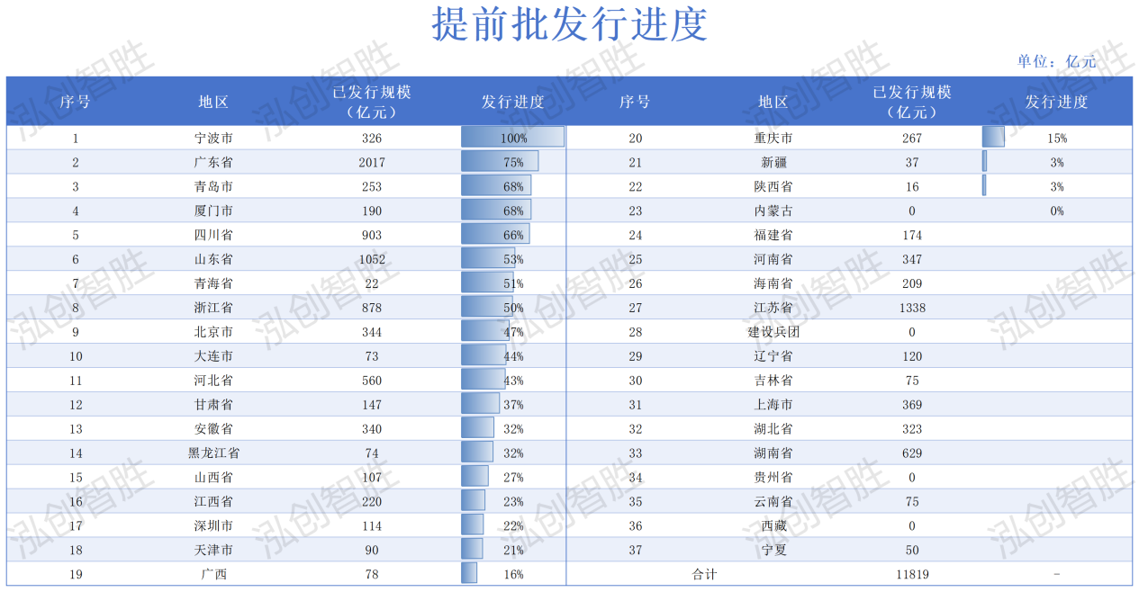四川省提前批额度1359亿元,已发行903亿元,发行完成66%;