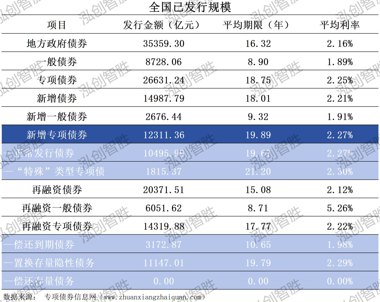全国发行新增地方政府债券14987.79亿元,其中专项债券12311.36亿元,按全年4.4万亿限额计算,发行进度为27.98%;一般债券2676.44亿元,按全年8000亿限额计算,发行进度为33.46%。