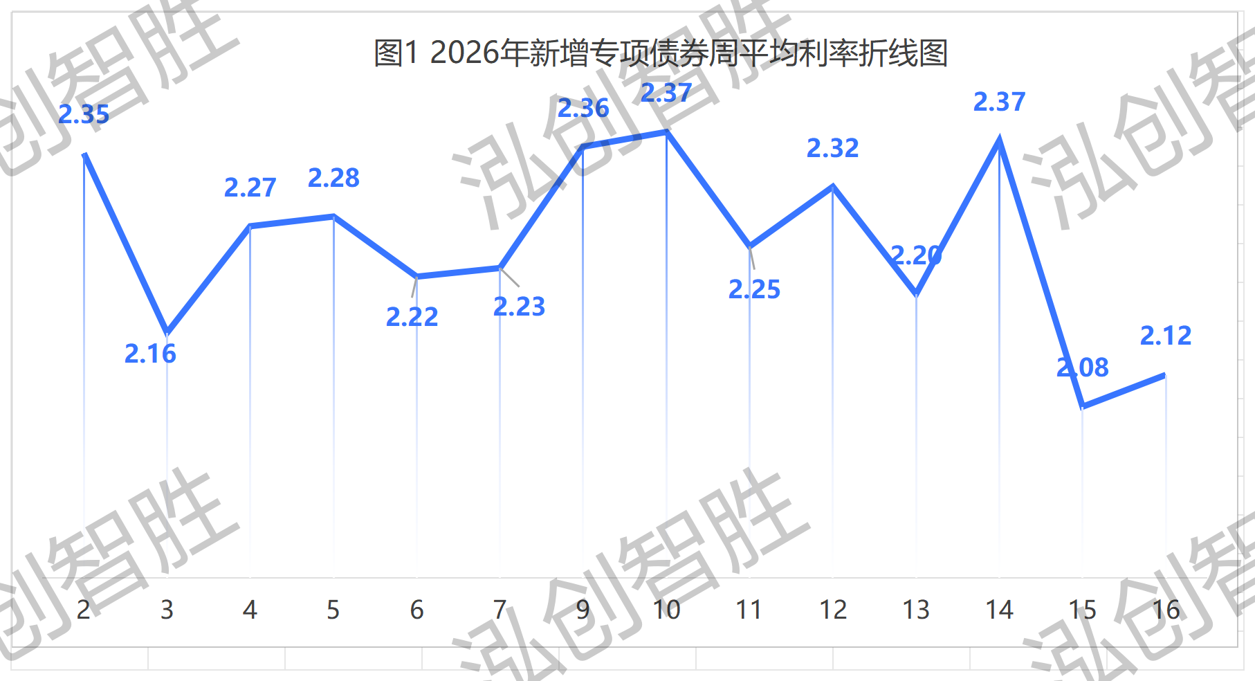 2026年新增专项债券平均利率为2.27%。从周平均利率来看,本周平均利率为2.12%,位于全年新增专项债券利率较低位置,全年第10、14周平均利率最高,为2.37%。
