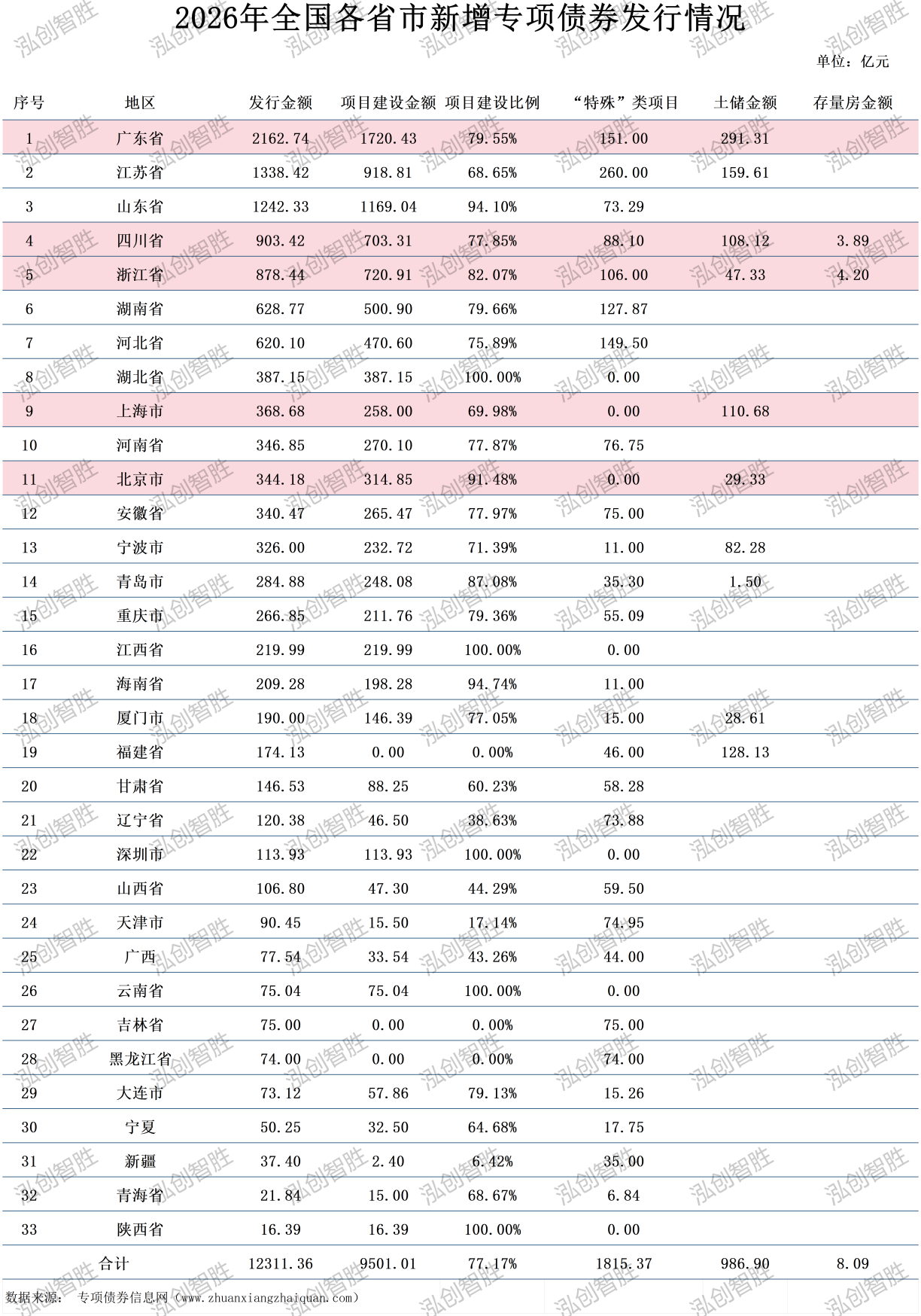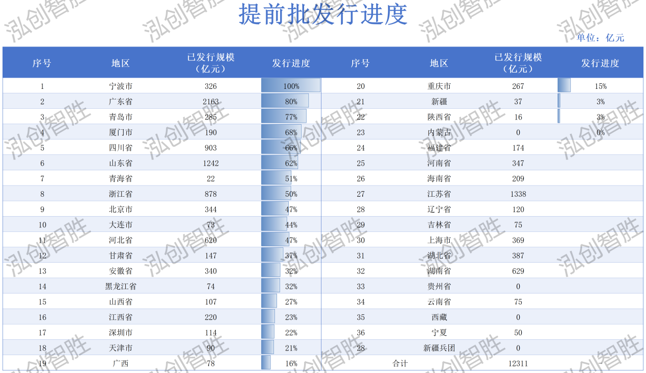 广东省提前批限额2700亿元,已发行2163亿元,发行完成80%;