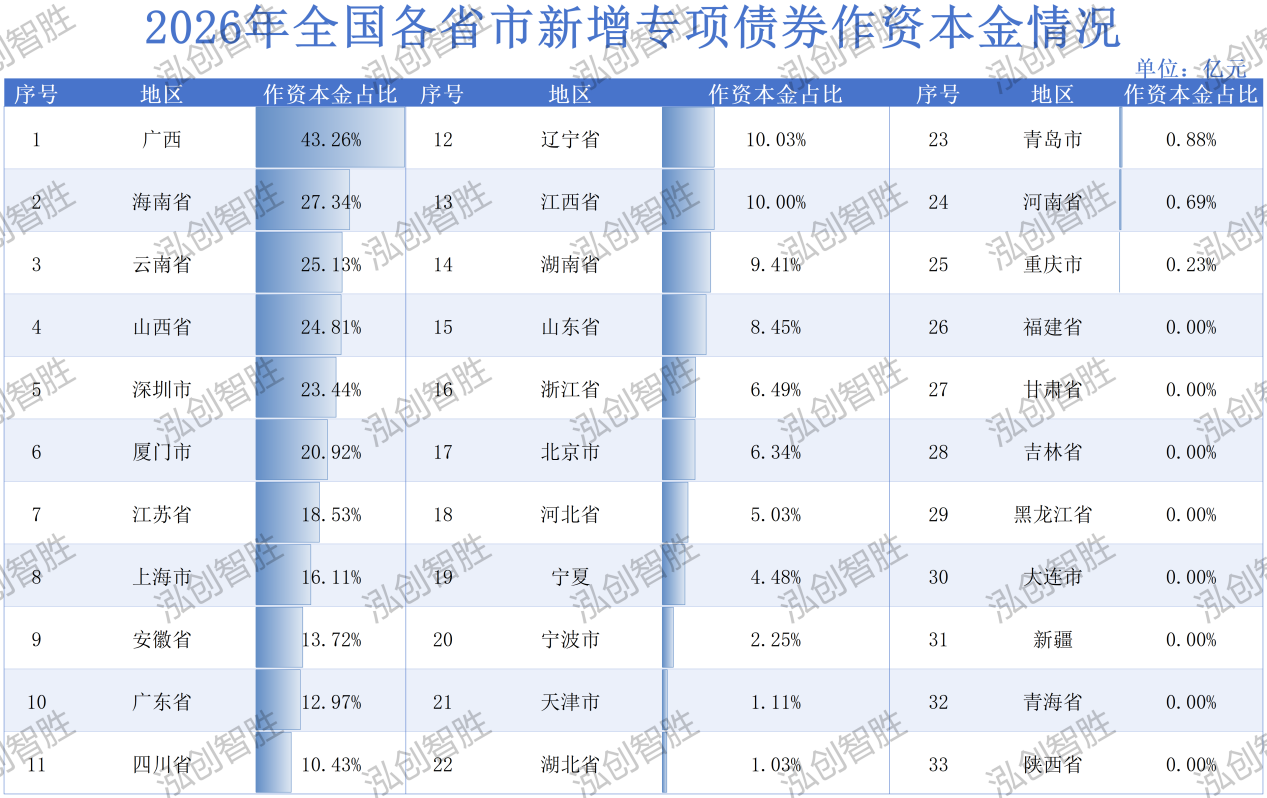 作资本金情况:本周广西地区新增专项债券用作资本金占比最高,为30.25%,做资本金金额45.37亿元。