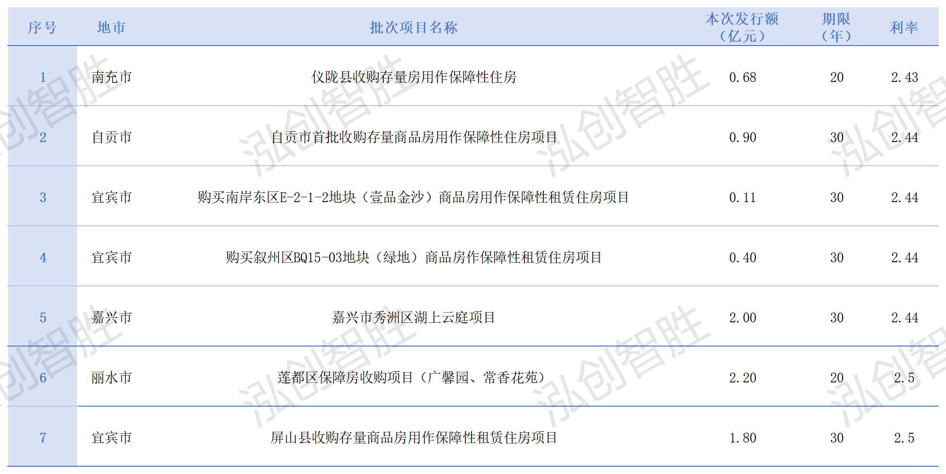 四川省、浙江省发行存量商品房8.09亿元,其中四川省发行3.89亿元,项目包括“屏山县收购存量商品房用作保障性租赁住房项目”等5个项目;浙江省发行4.20亿元,项目为“嘉兴市秀洲区湖上云庭项目”、“莲都区保障房收购项目(广馨园、常香花苑)”。