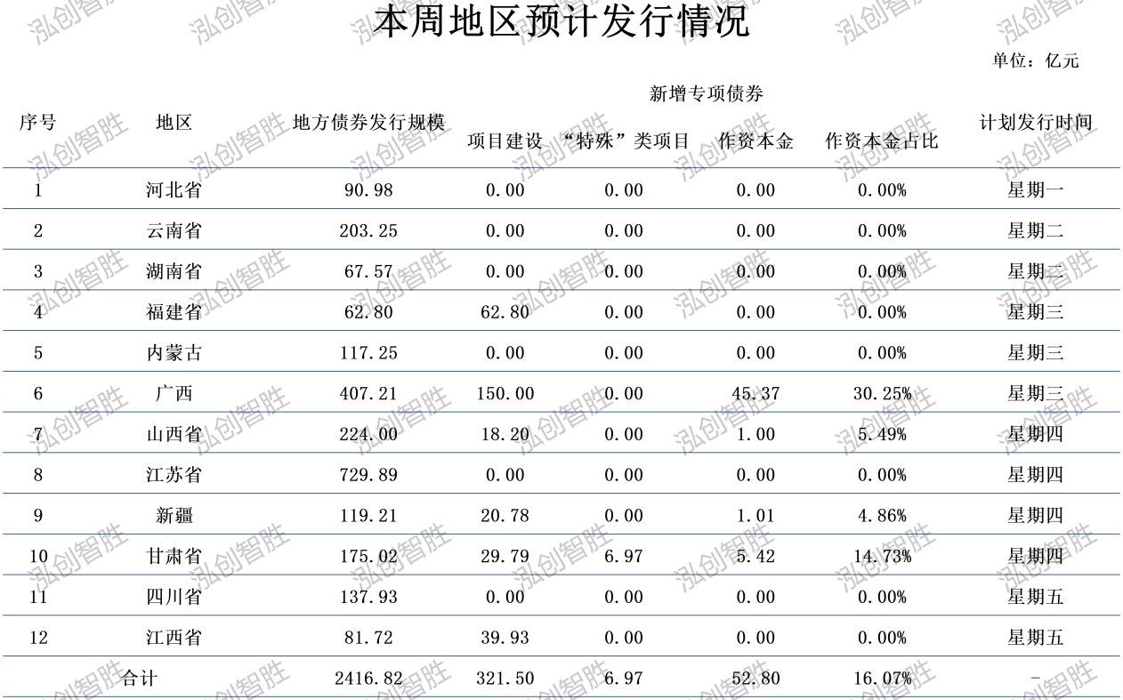 本周共有云南省、河北省等12个地区计划发行50期地方政府债券,发行规模2416.82亿元;其中,新增专项债券计划发行24期地方政府债券,发行规模328.47亿元。