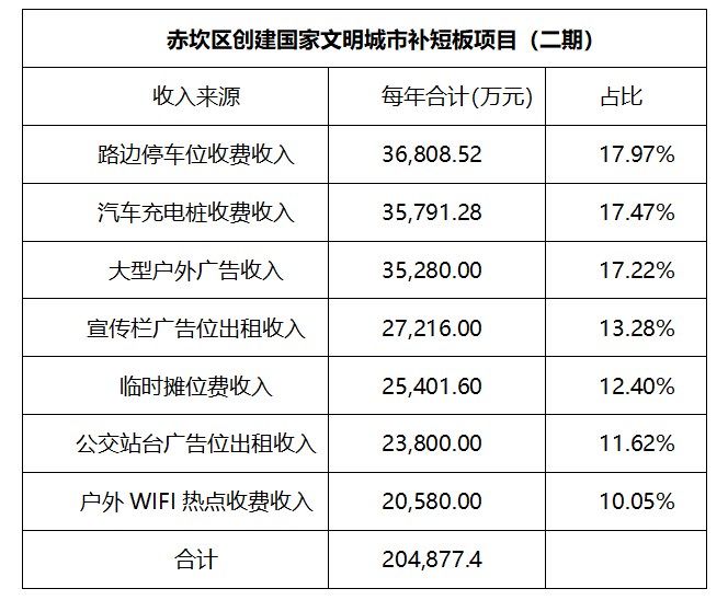 本项目营业收入主要源于路边停车位收费收入、汽车充电桩收费收入、大型户外广告收入、宣传栏广告位出租收入、临时摊位收费收入、公交车站广告位出租收入、户外WIFI热点收费收入等,运营期内预计取得收入204,877.4万元,运营成本合计10,116.12万元,运营结余194,761.28万元。