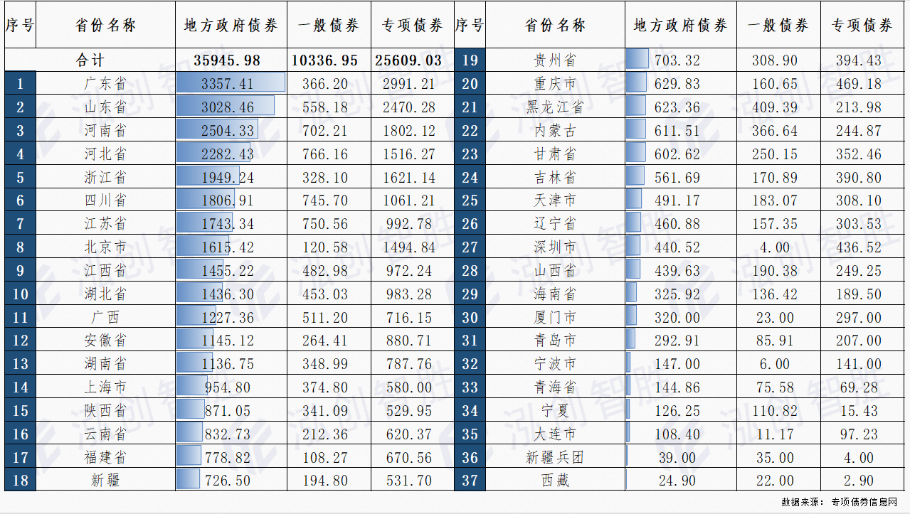 其中,专项债券25609亿元,一般债券10337亿元;其中,新增债券25900亿元,再融资债券10046亿元。