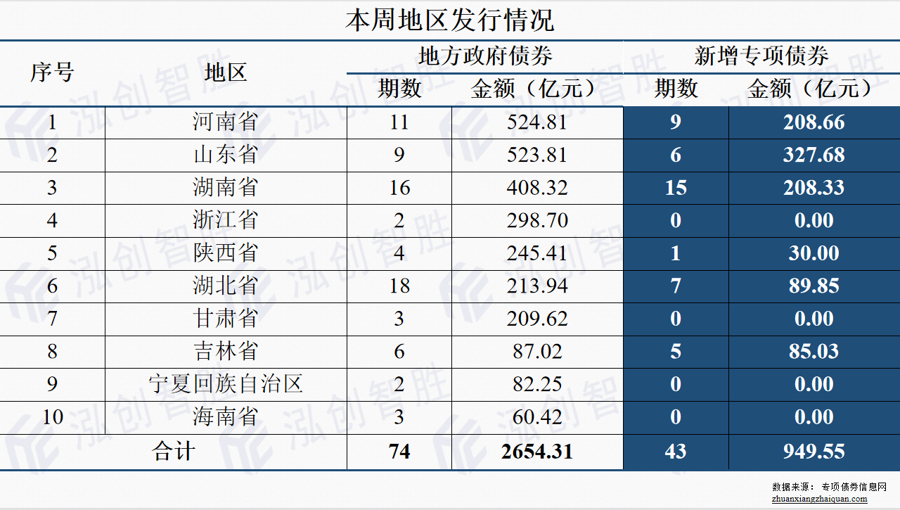 本周河南、山东、湖南、浙江、陕西、湖北、甘肃、吉林、宁夏、海南10个地区成功发行74期地方政府债券,发行规模2654.31亿元。