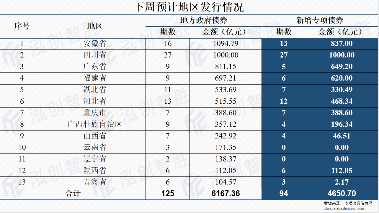下周预计有13个地区(安徽、四川、广东、福建、湖北、河北、重庆、广西、山西、云南、辽宁、陕西、青海)计划发行125期地方政府债券;