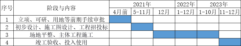 项目前期工作从2020年7月份已经展开,施工前期准备工作在2021年11月全部完成,2021年12月开工建设,2023年12月完成竣工验收。