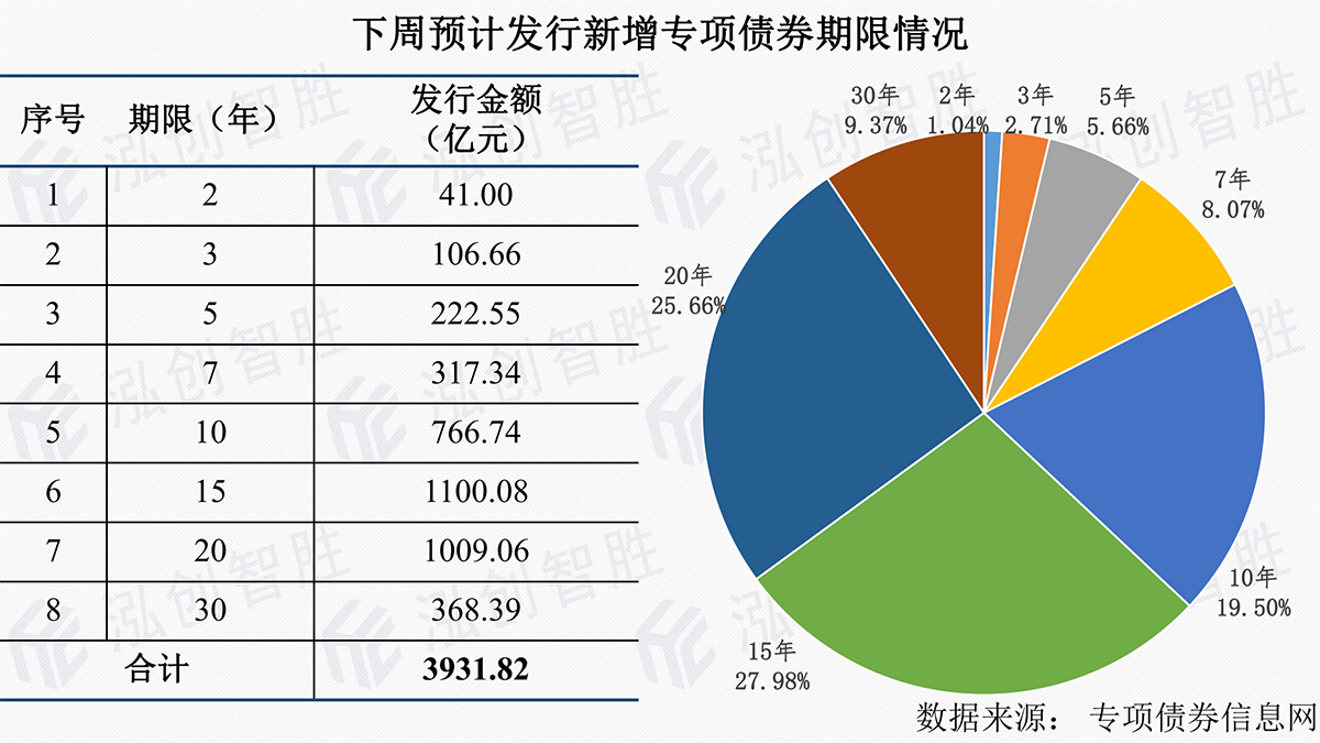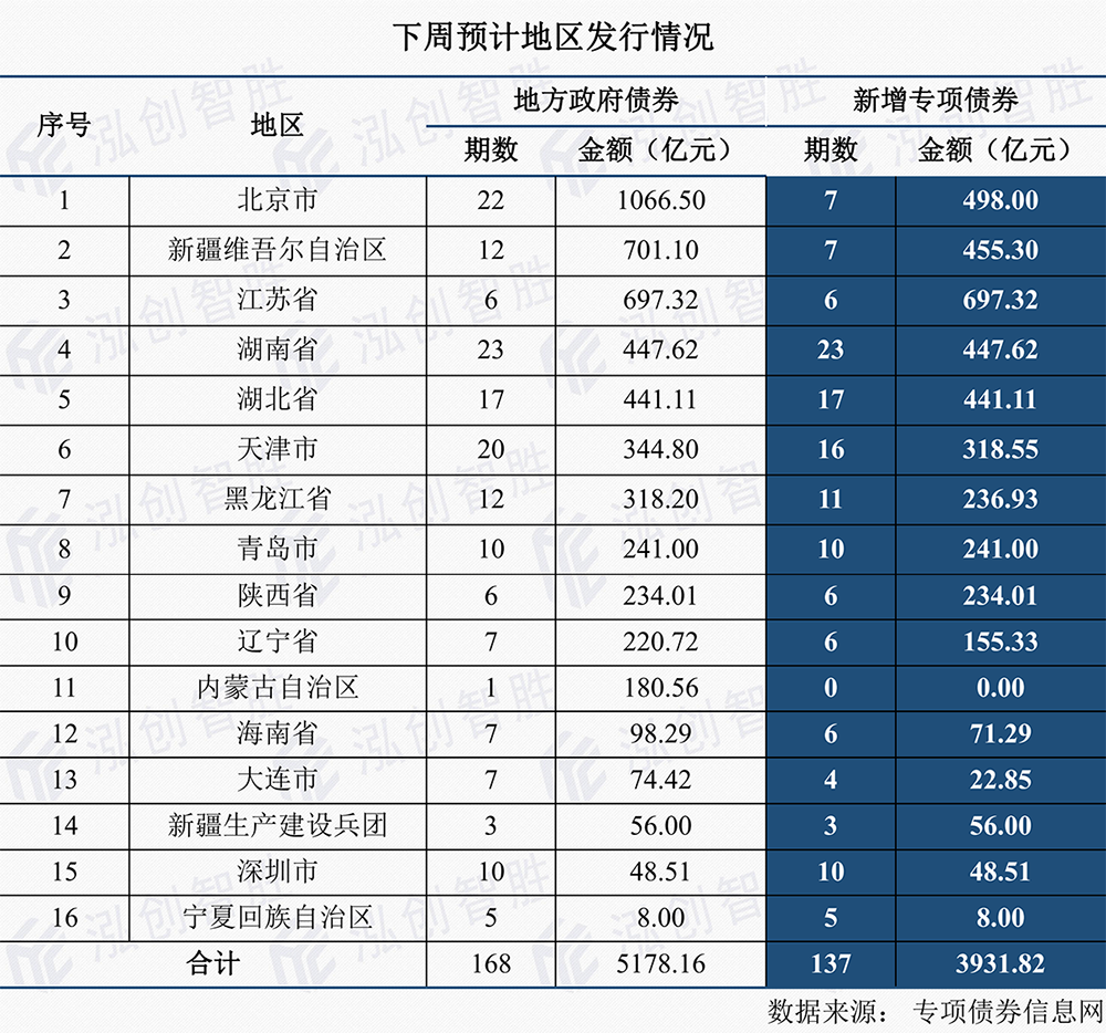 下周预计有16个地区(北京、新疆、江苏、湖南、湖北、天津、黑龙江、青岛、陕西、辽宁、内蒙古、海南、大连、兵团、深圳、宁夏)计划发行168期地方政府债券。其中,新增专项债券共137期,发行规模3931.82亿元。