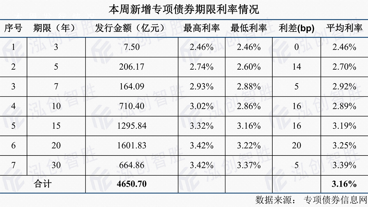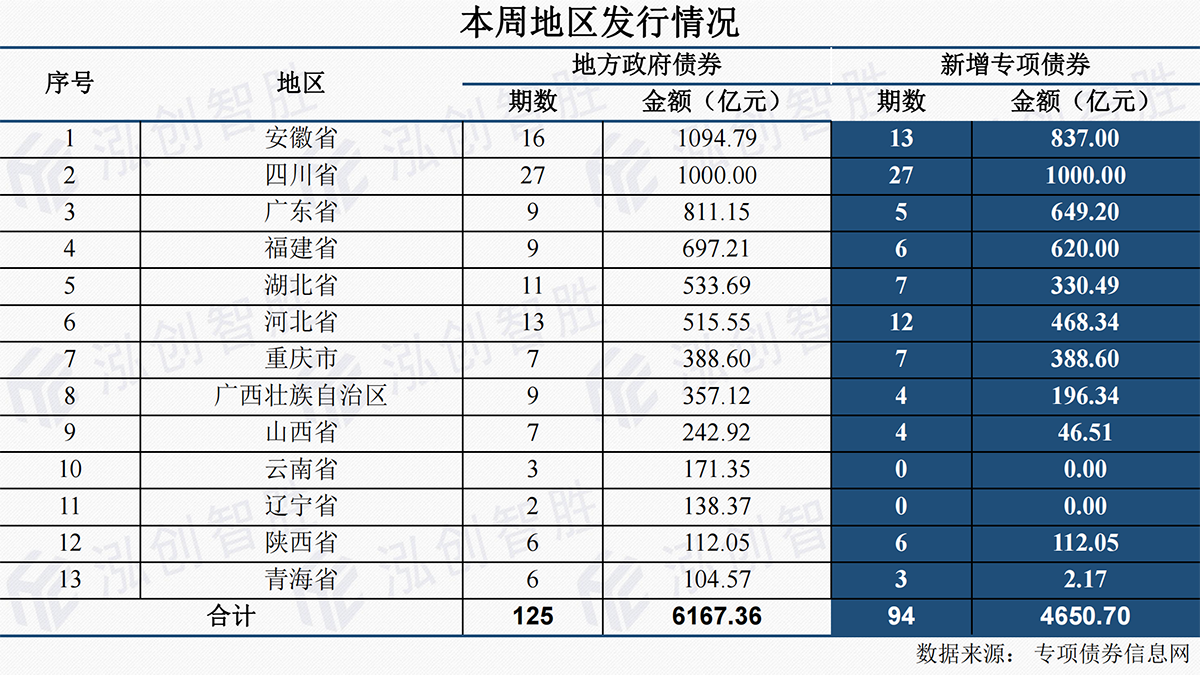 本周有13个地区(安徽、四川、广东、福建、湖北、河北、重庆、广西、山西、云南、辽宁、陕西、青海)发行125期地方政府债券,发行规模4650.70亿元。其中,新增专项债券共94期,发行规模4650.70亿元。