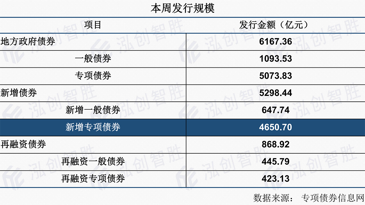 本周地方政府债券发行规模6167.36亿元,其中,专项债券5073.83亿元,一般债券1093.53亿元;包括新增债券5298.44亿元(含专项债券4650.70亿元),