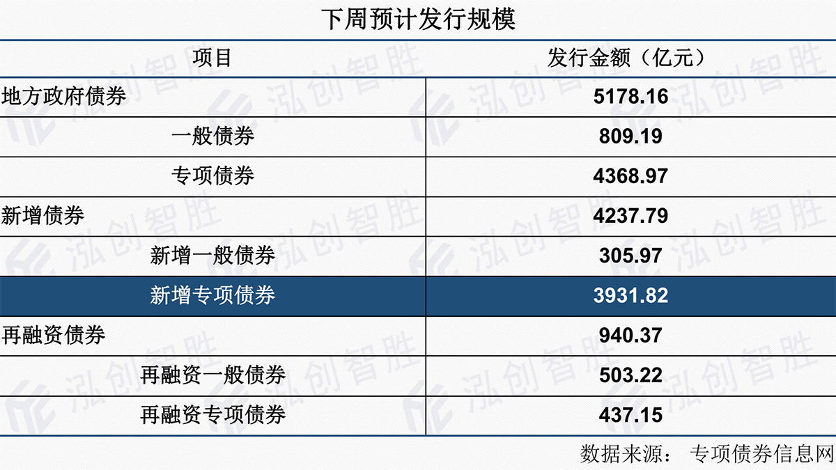 下周地方政府债券预计发行规模5178.16亿元,其中专项债券4368.97亿元,一般债券809.19亿元;包括新增债券4237.79亿元(含专项债券3931.82亿元),从特殊再融资发行来看,北京市下周预计发行304.7798亿元特殊再融资。