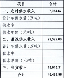 项目收益来源为农村供水收入、灌溉供水收入、水库水面资源、水库周围土地、附属设施设备租赁收入。